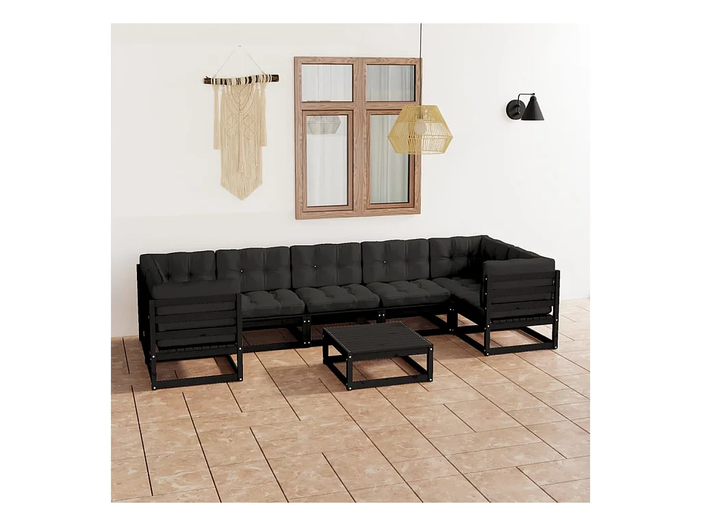 Salon de jardin 8 pcs avec coussins Noir Bois de pin massif