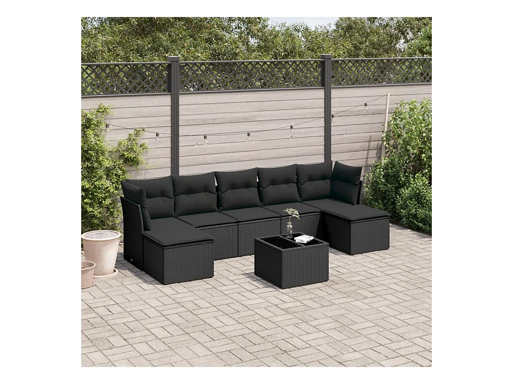 Salon de jardin 8 pcs avec coussins noir résine tressée