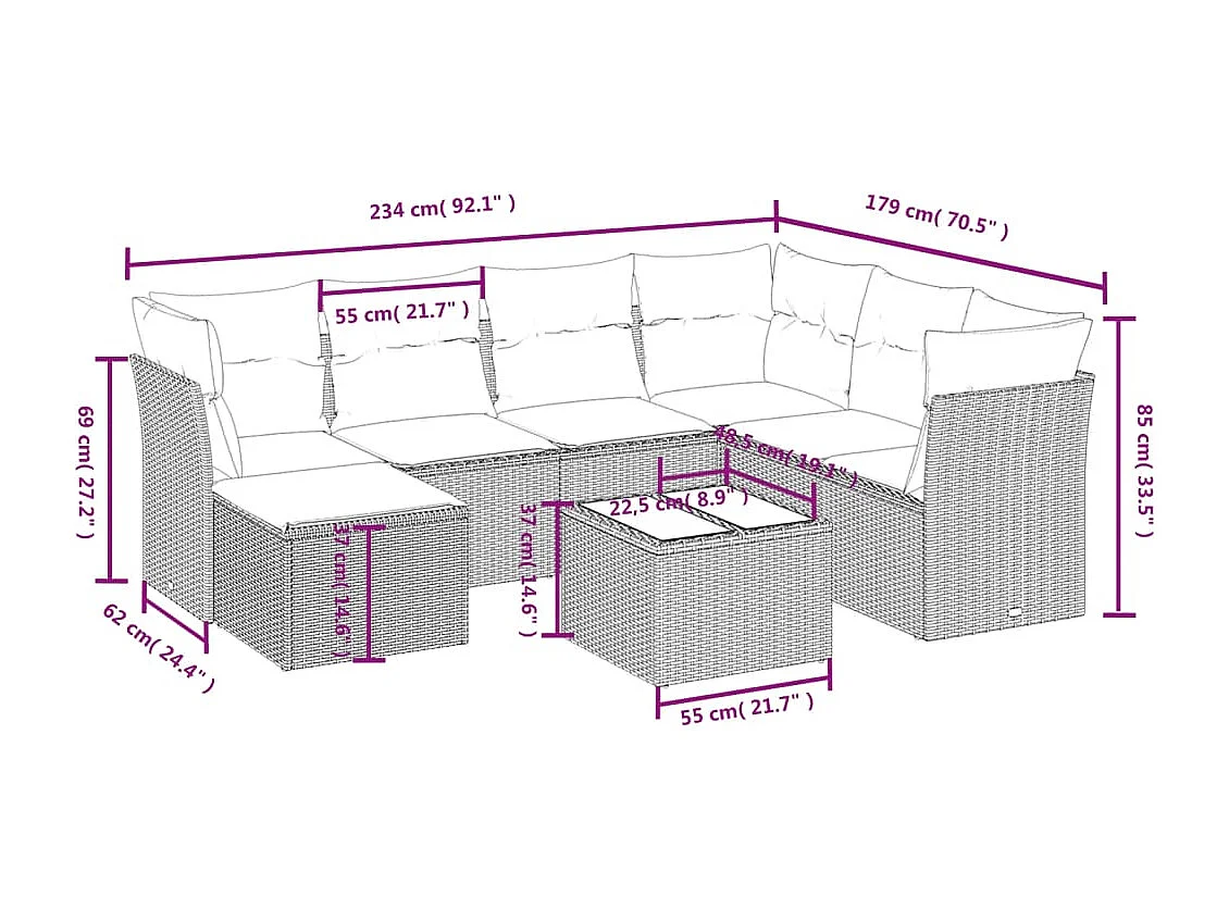 Salon de jardin 9 pièces avec coussins gris clair résine tressée