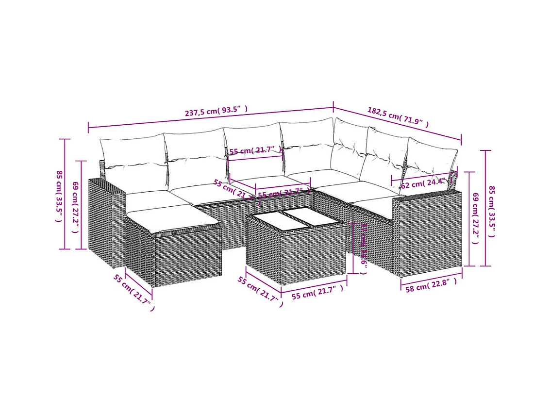 Salon de jardin 8 pièces avec coussins gris clair résine tressée
