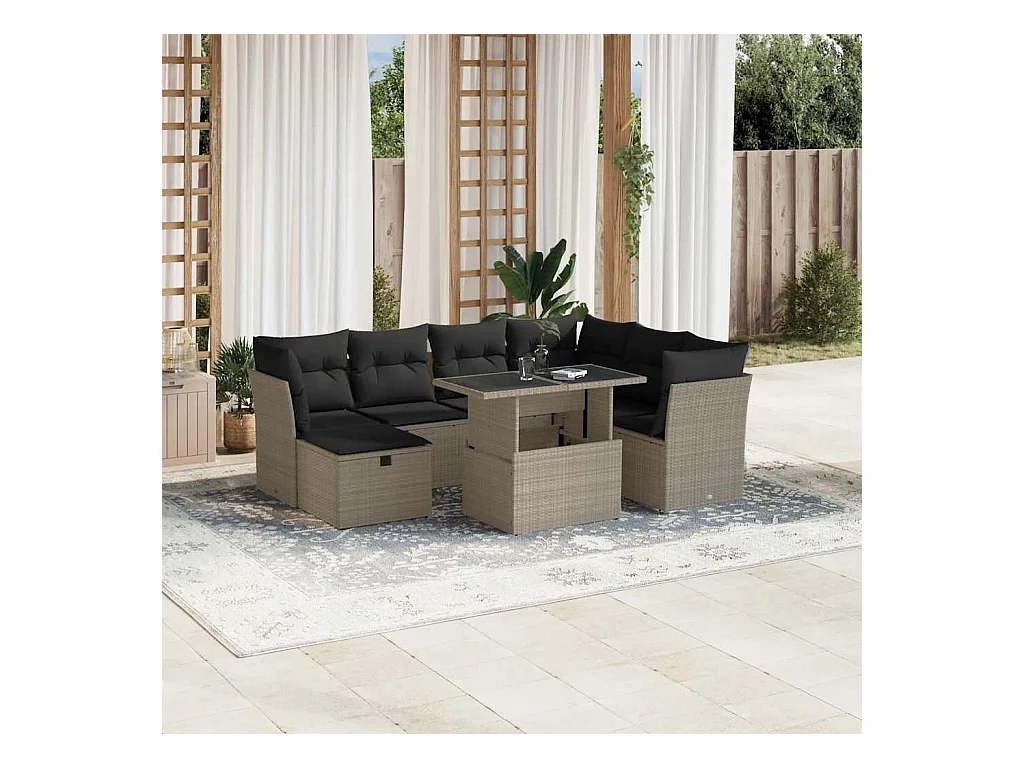 Salon de jardin 8 pièces avec coussins gris clair résine tressée
