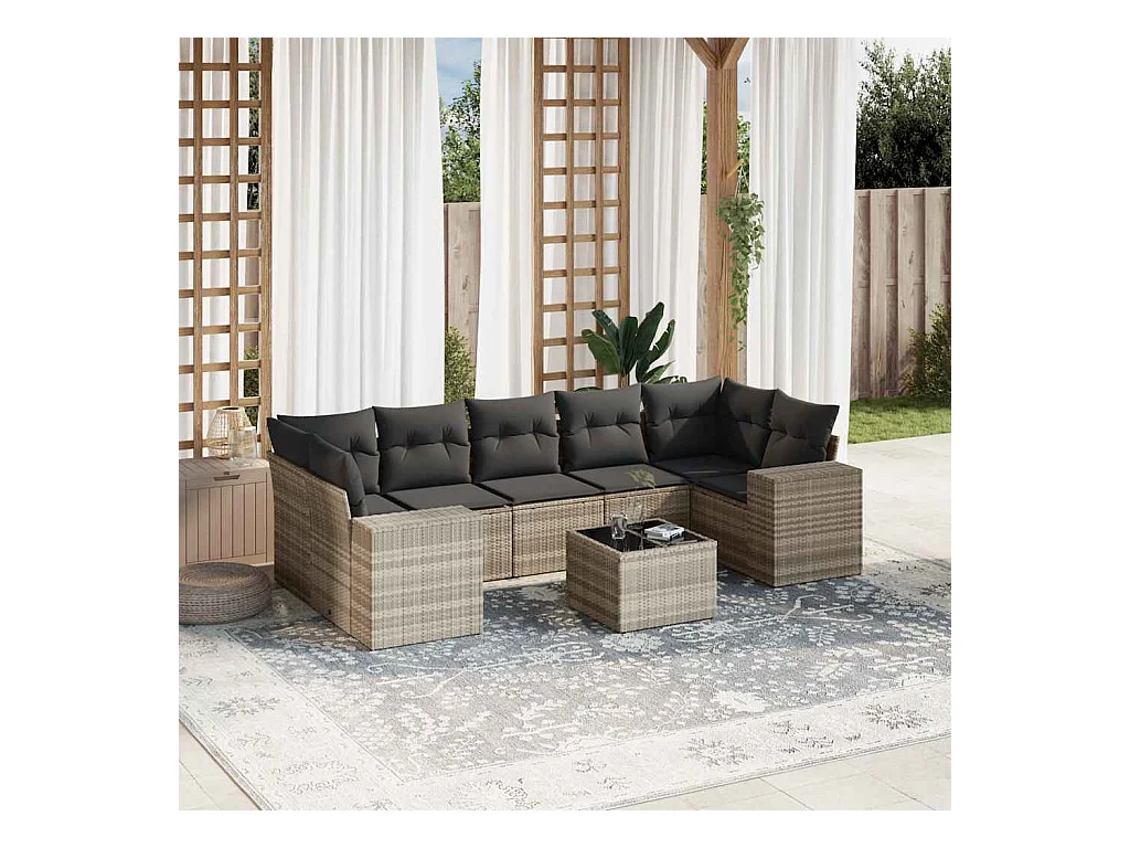 Salon de jardin 8 pièces avec coussins gris résine tressée