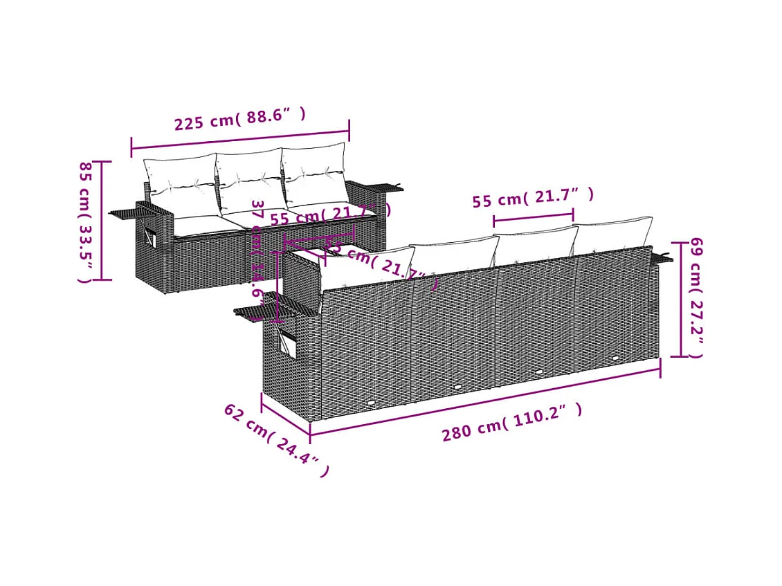 Salon de jardin 8 pièces avec coussins marron résine tressée