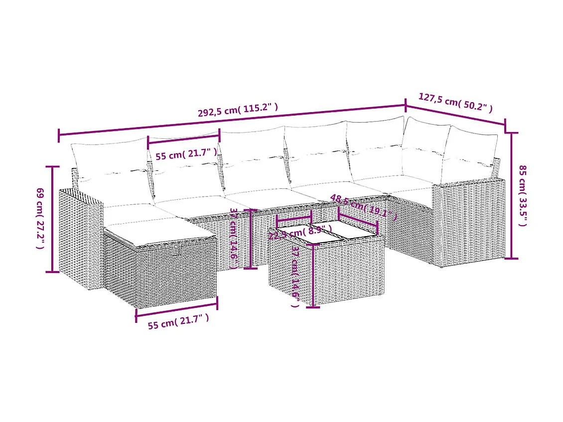 Salon de jardin 8 pièces avec coussins marron résine tressée