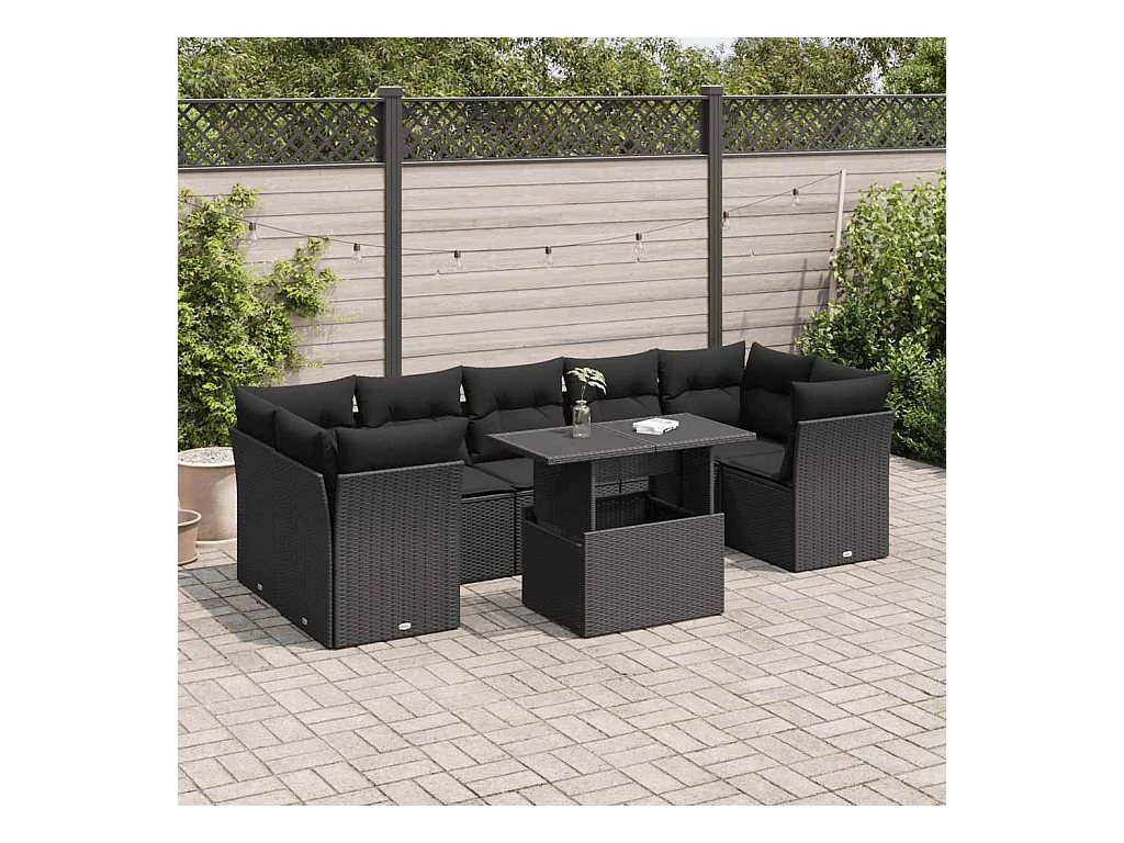 Salon de jardin 8 pièces avec coussins noir résine tressée