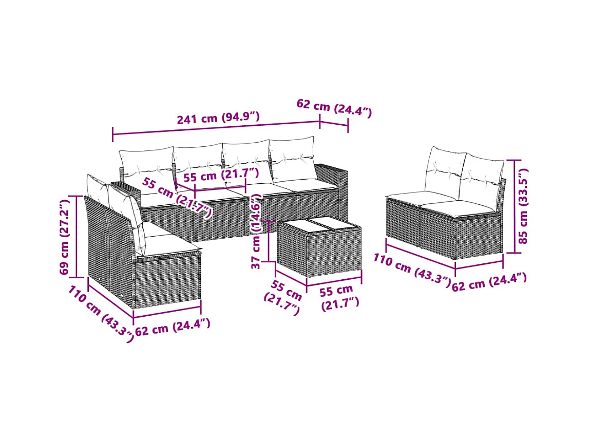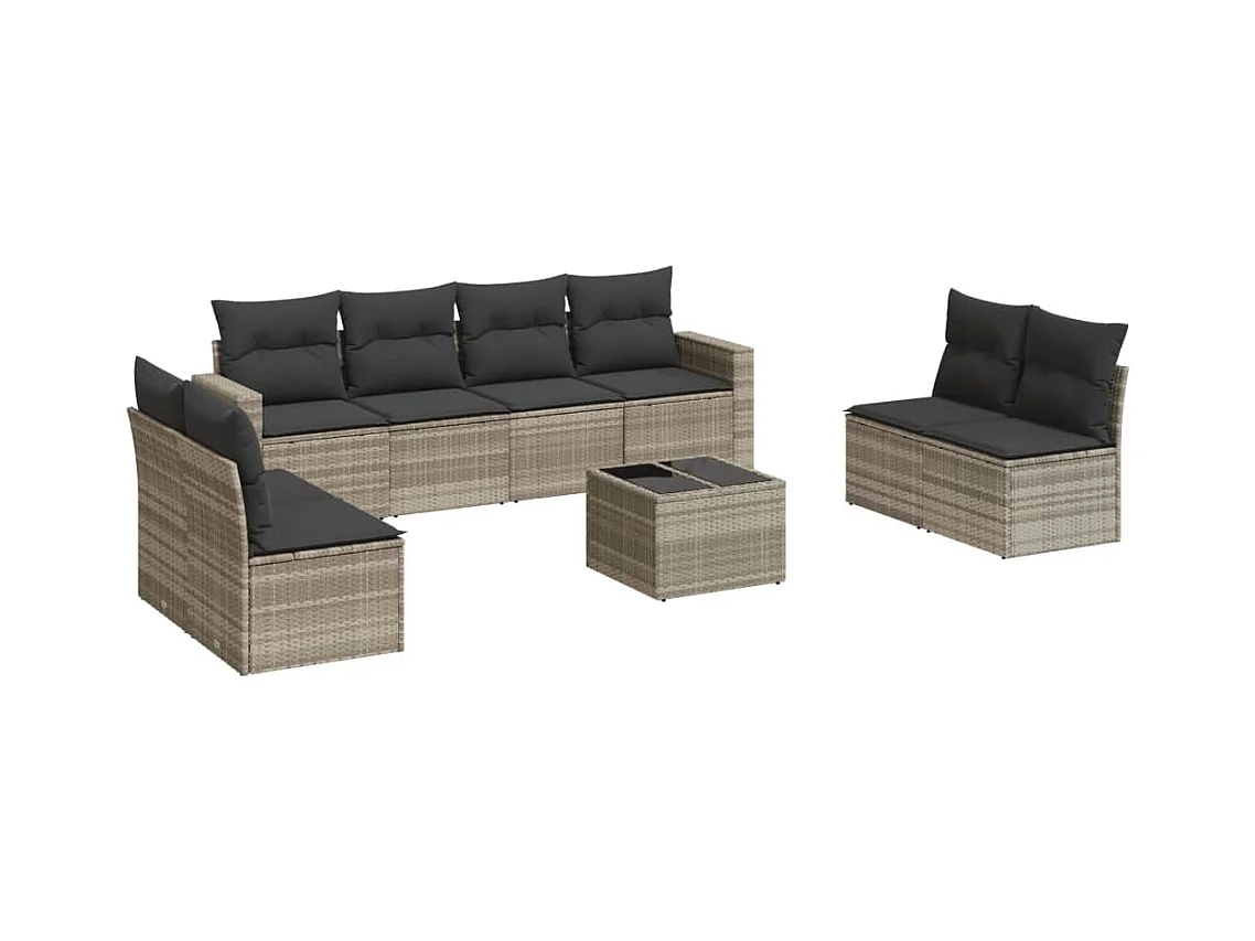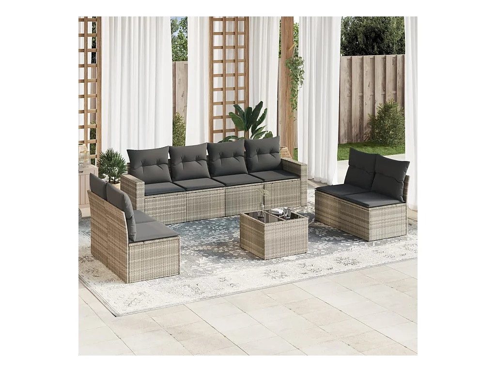 Salon de jardin 9 pcs avec coussins gris clair résine tressée