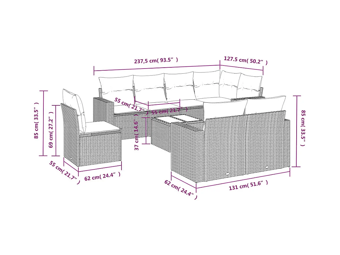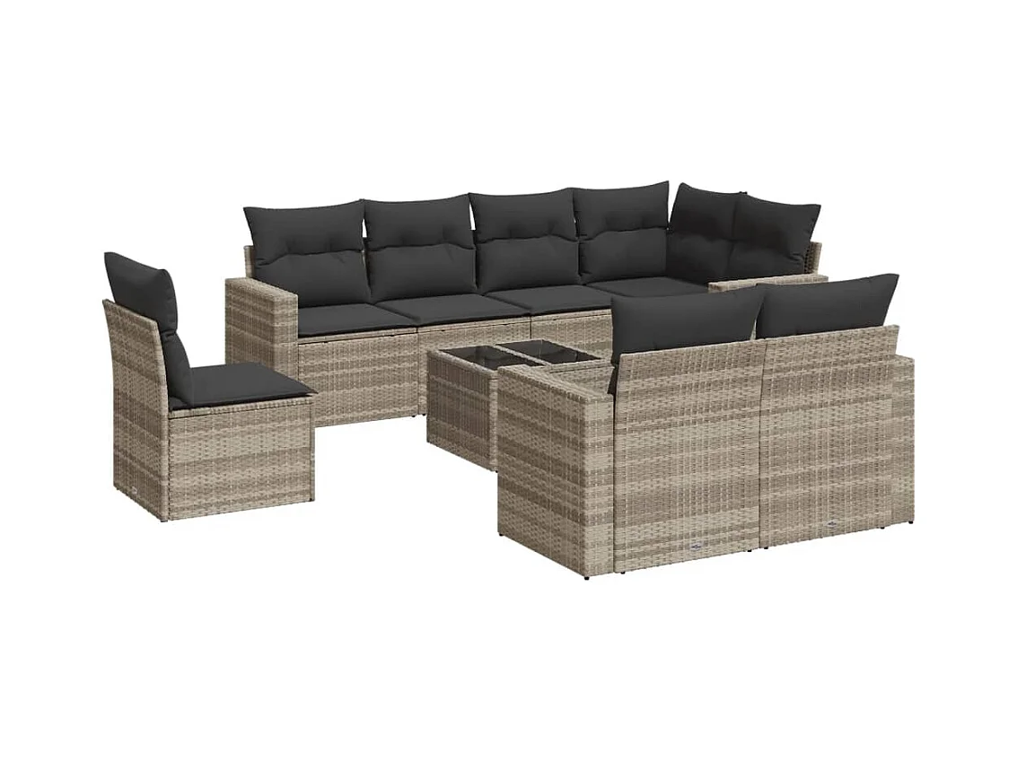 Salon de jardin 9 pcs avec coussins gris clair résine tressée