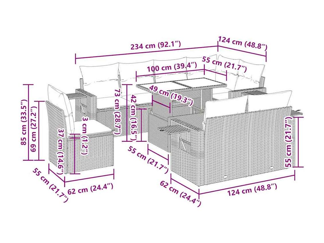Salon de jardin 9 pcs avec coussins gris résine tressée