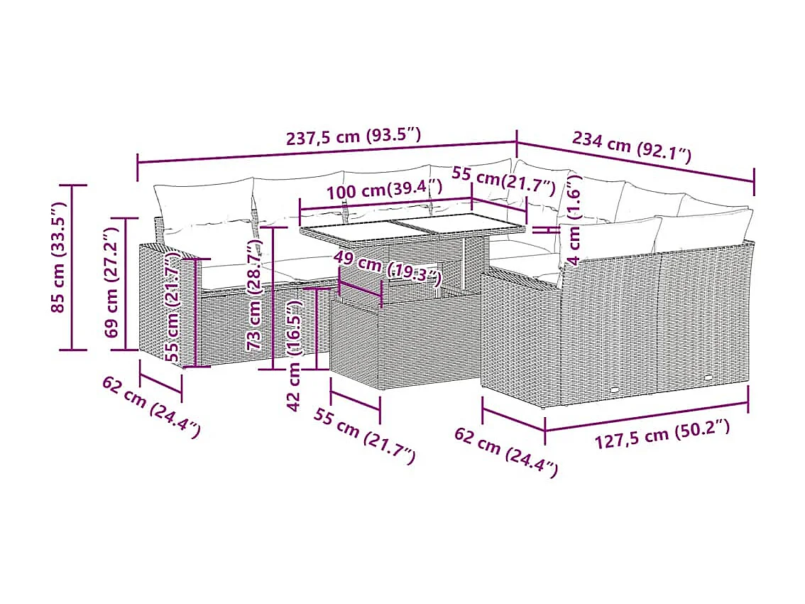 Salon de jardin 9 pcs avec coussins gris résine tressée