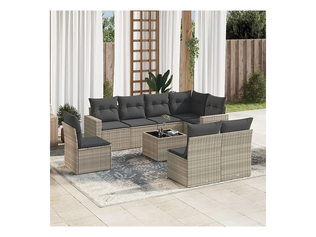Salon de jardin 9 pcs avec coussins gris clair résine tressée