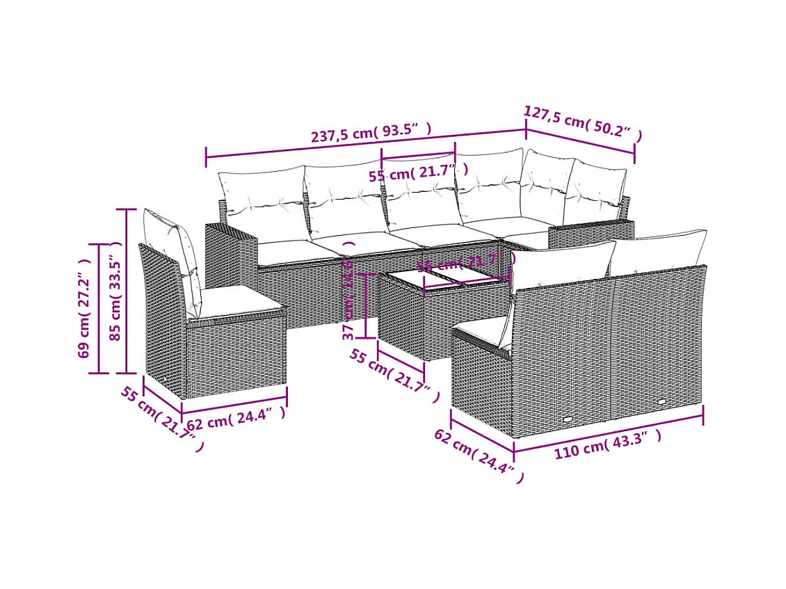 Salon de jardin 9 pcs avec coussins gris résine tressée