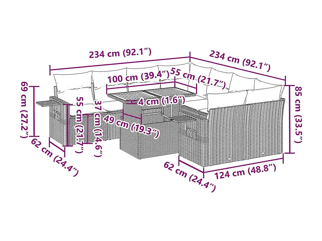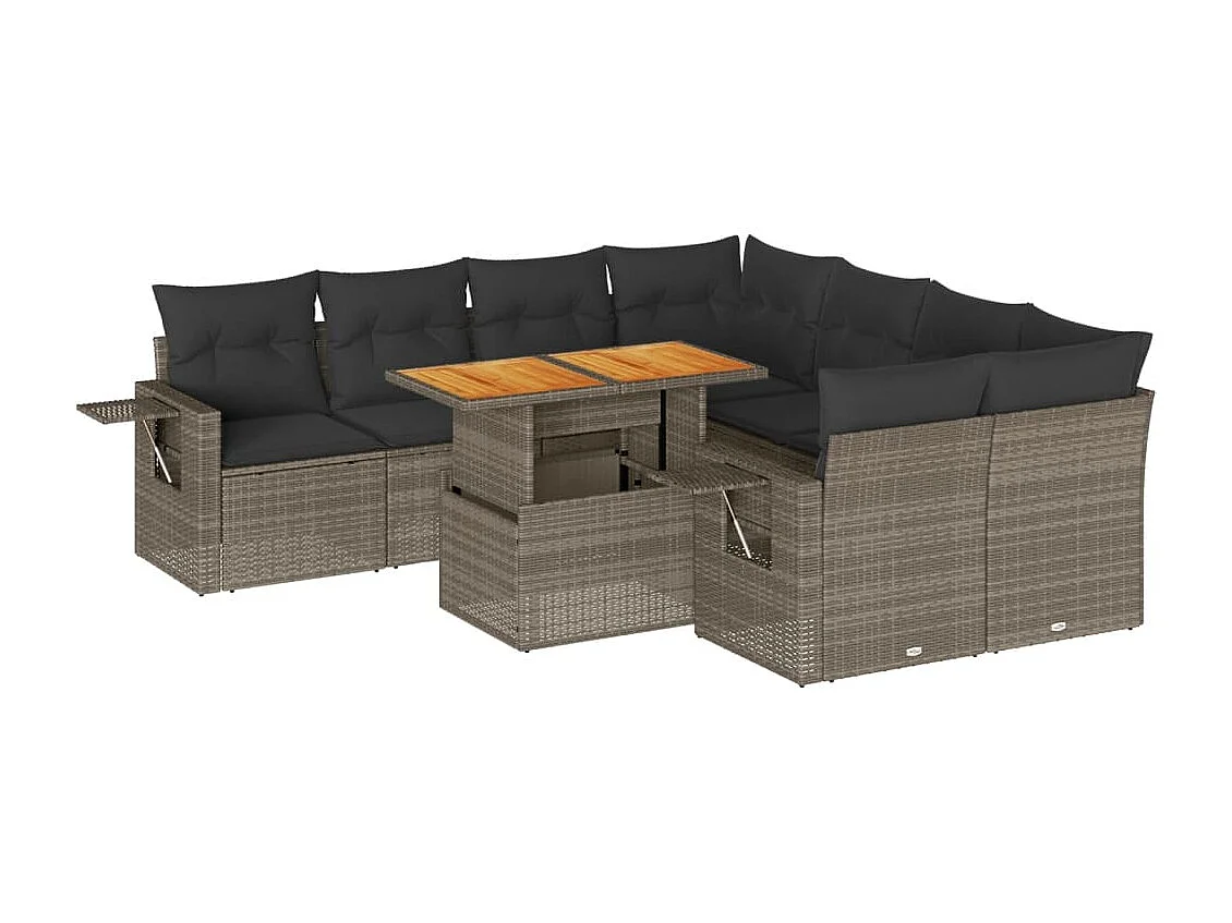 Salon de jardin 9 pcs avec coussins gris résine tressée