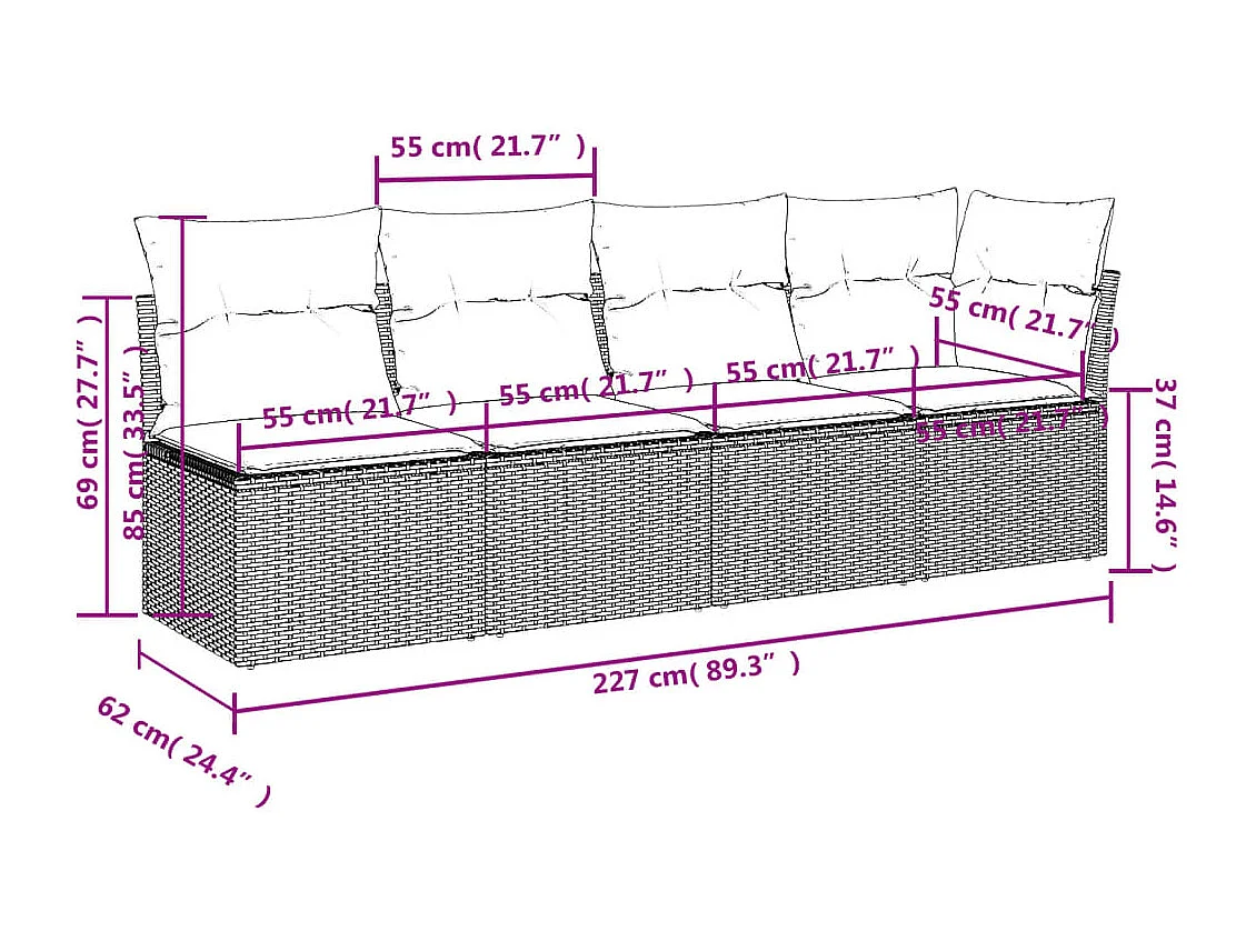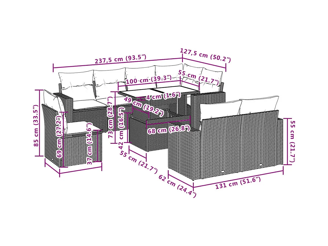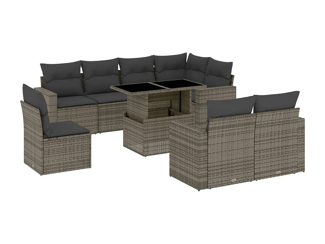 Salon de jardin 9 pcs avec coussins gris résine tressée