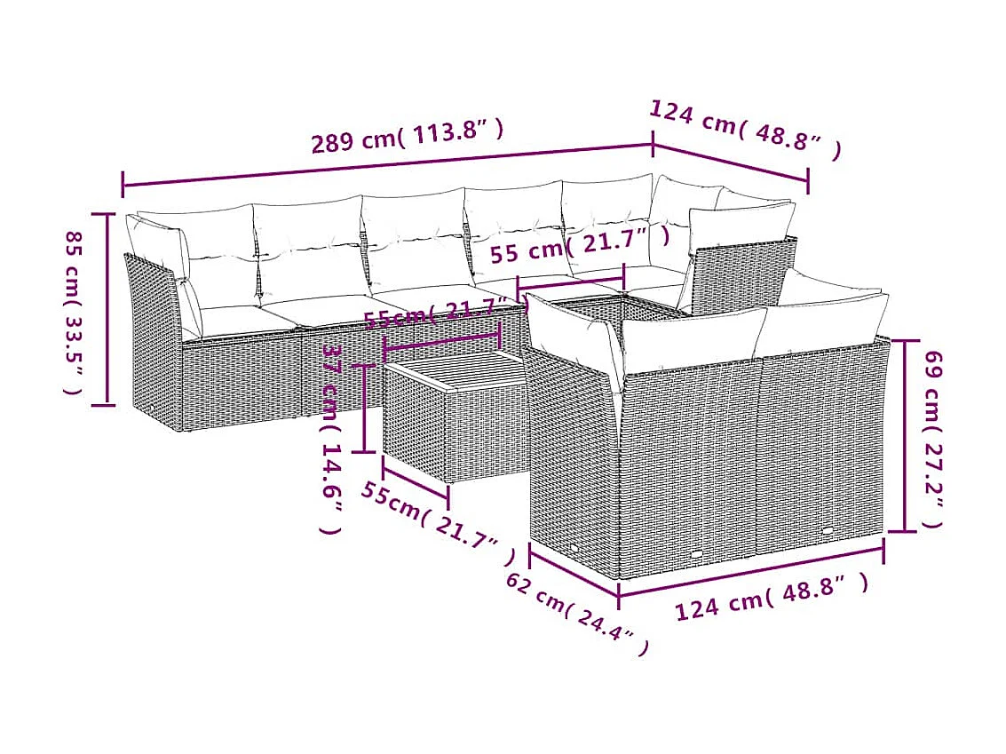 Salon de jardin 9 pcs avec coussins gris résine tressée