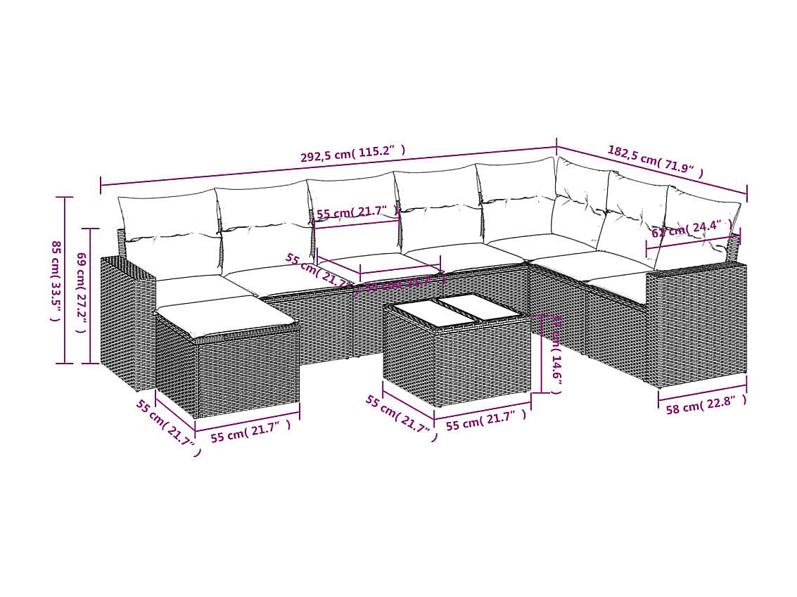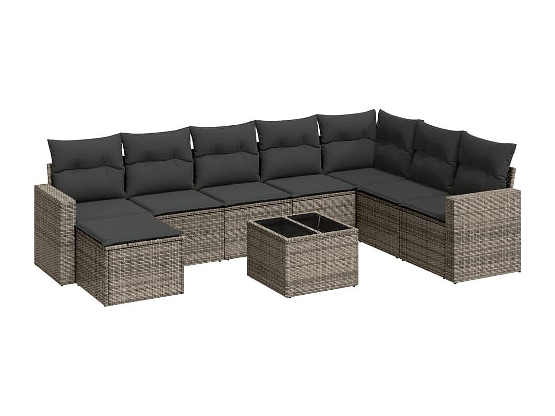 Salon de jardin 9 pcs avec coussins gris résine tressée