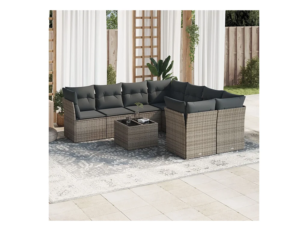 Salon de jardin 9 pcs avec coussins gris résine tressée