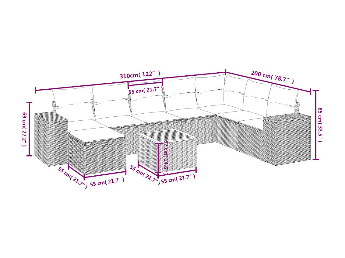 Salon de jardin 9 pcs avec coussins noir résine tressée