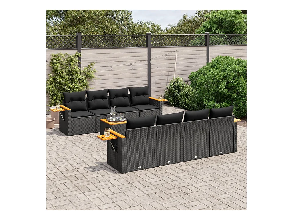 Salon de jardin 9 pcs avec coussins noir résine tressée