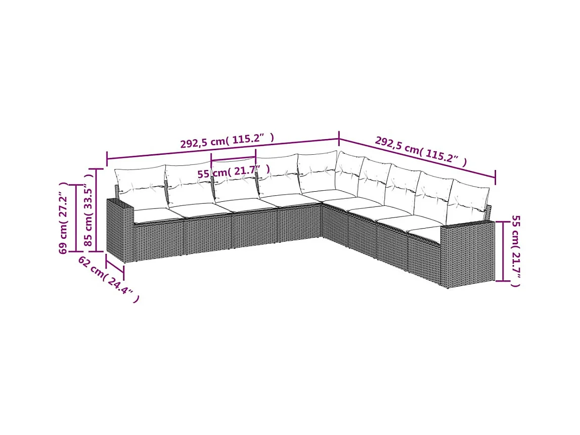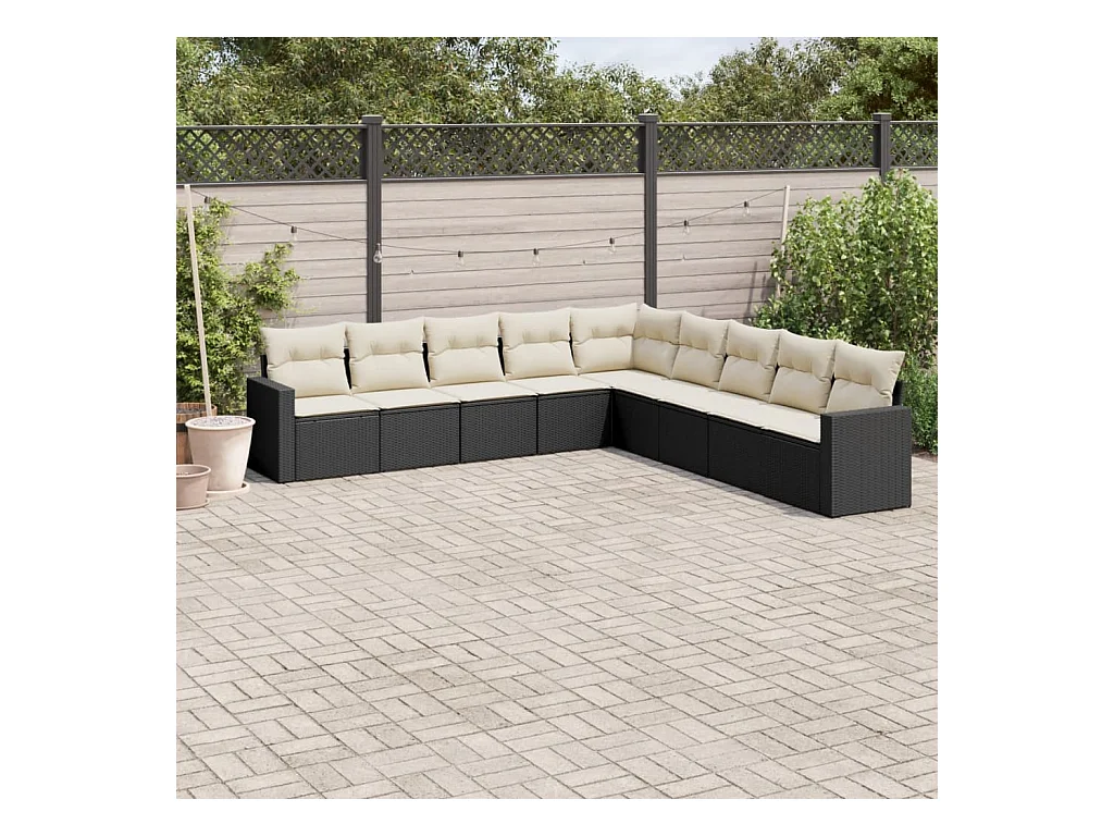 Salon de jardin 9 pcs avec coussins noir résine tressée