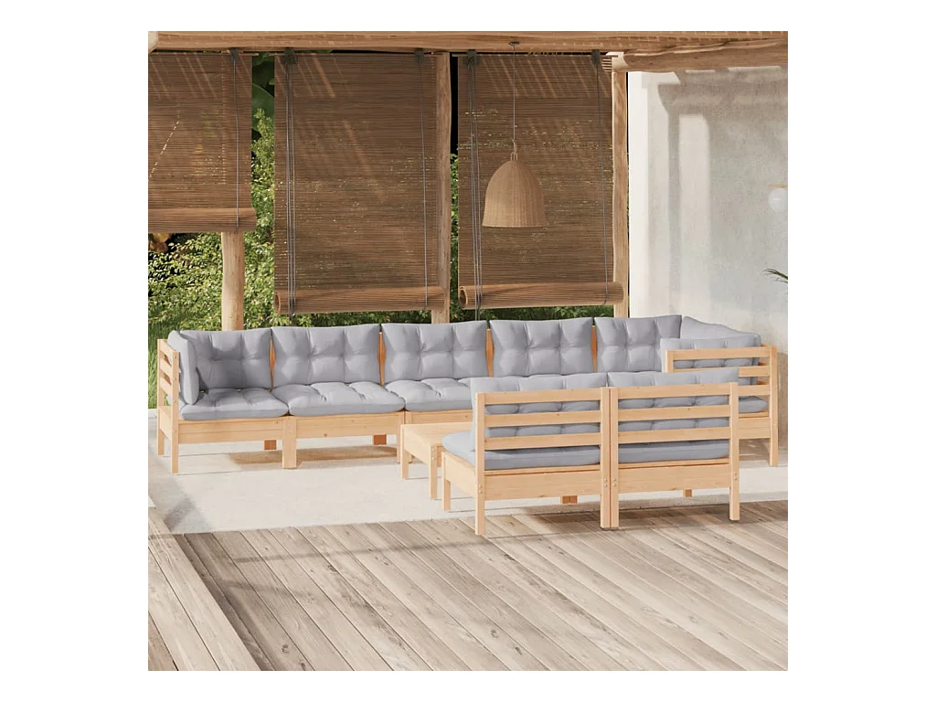 Salon de jardin 9 pièces avec coussins gris bois de pin