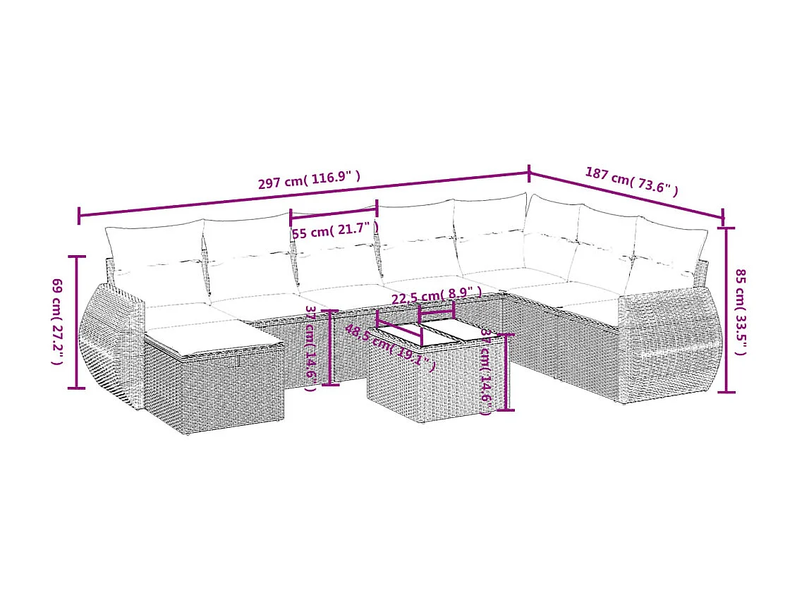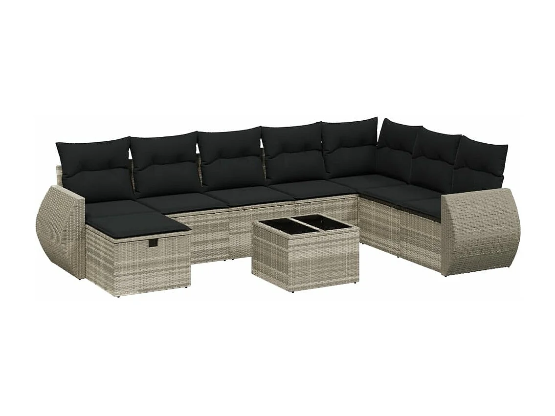 Salon de jardin 9 pièces avec coussins gris clair résine tressée