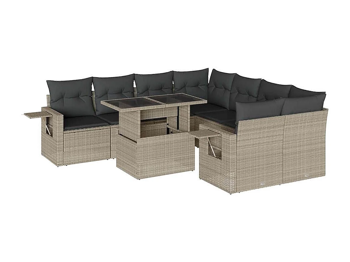 Salon de jardin 9 pièces avec coussins gris clair résine tressée