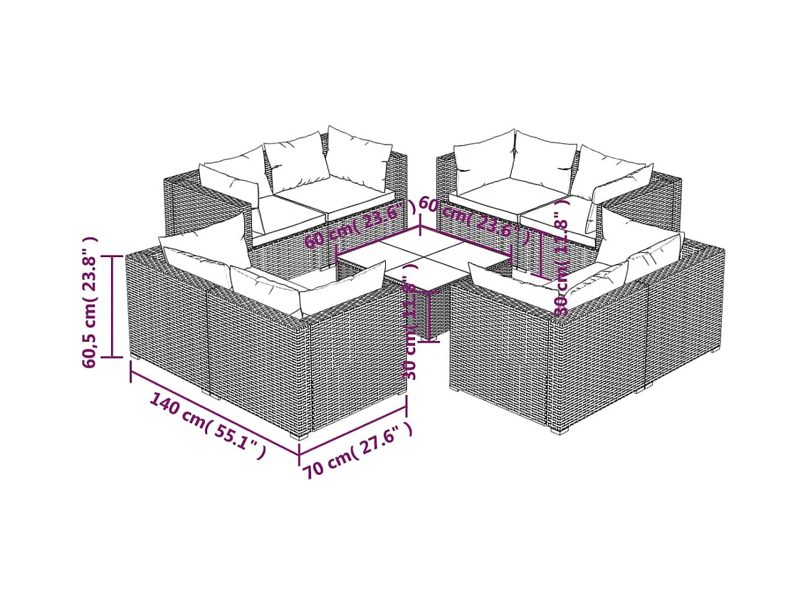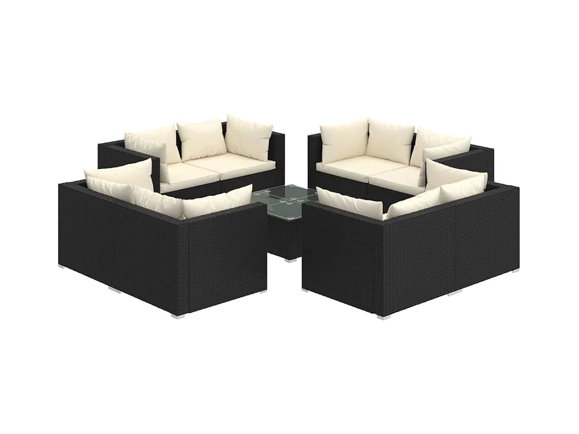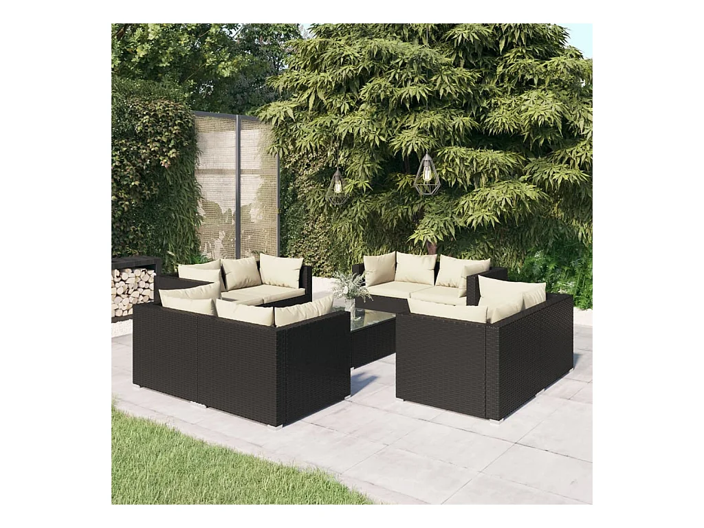 Salon de jardin 9 pièces avec coussins Résine tressée Noir