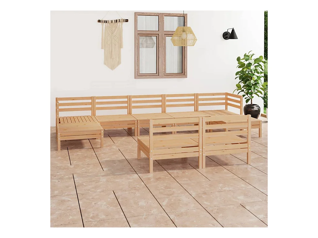 Salon de jardin 9 pièces marron miel bois de pin massif