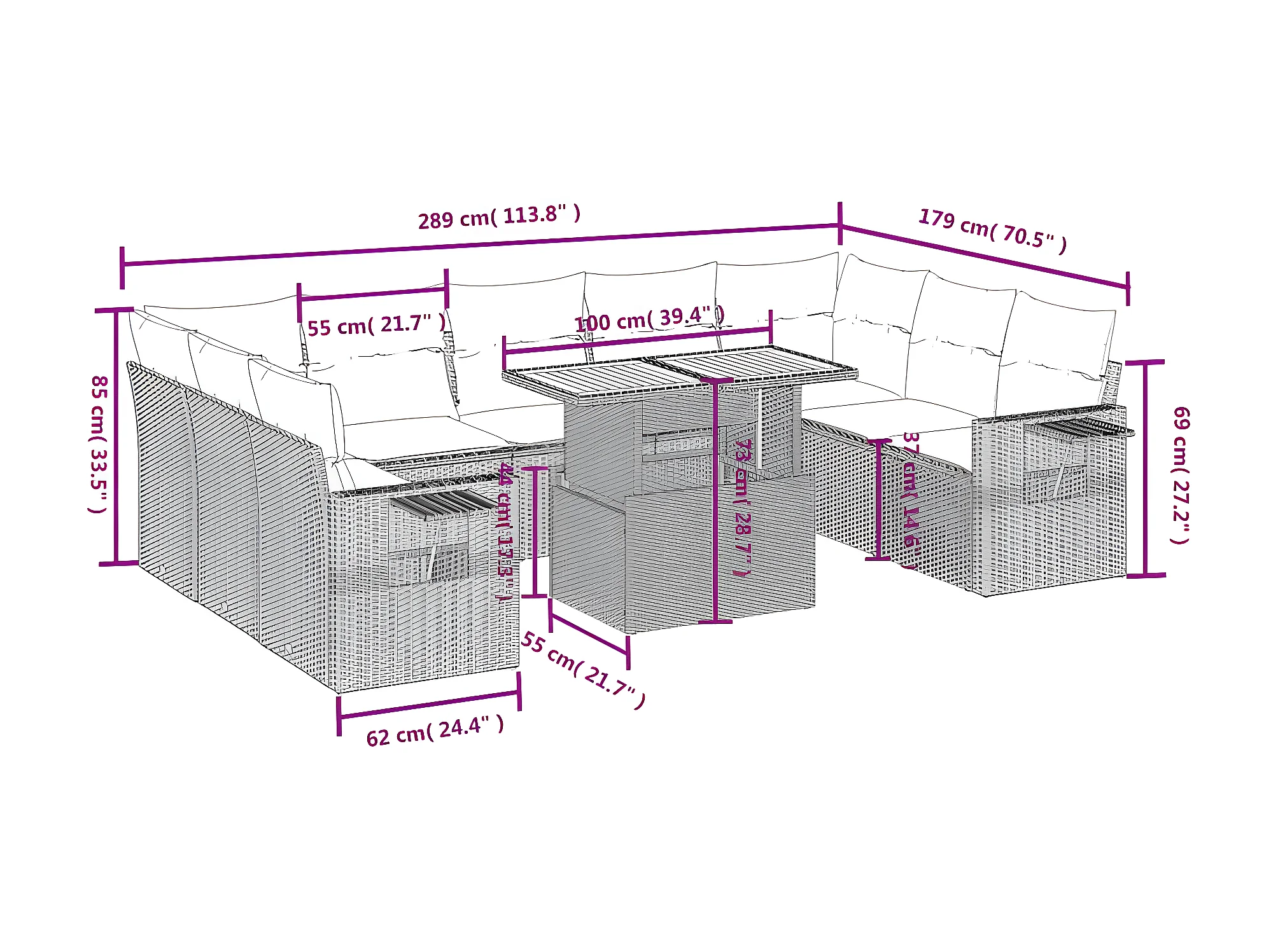 Salon de jardin avec coussins 10 pcs gris résine tressée