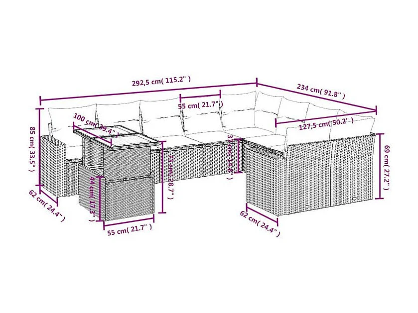 Salon de jardin avec coussins 10 pcs gris résine tressée