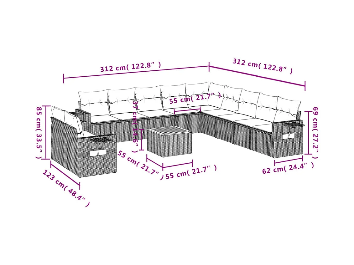 Salon de jardin avec coussins 10 pcs gris résine tressée