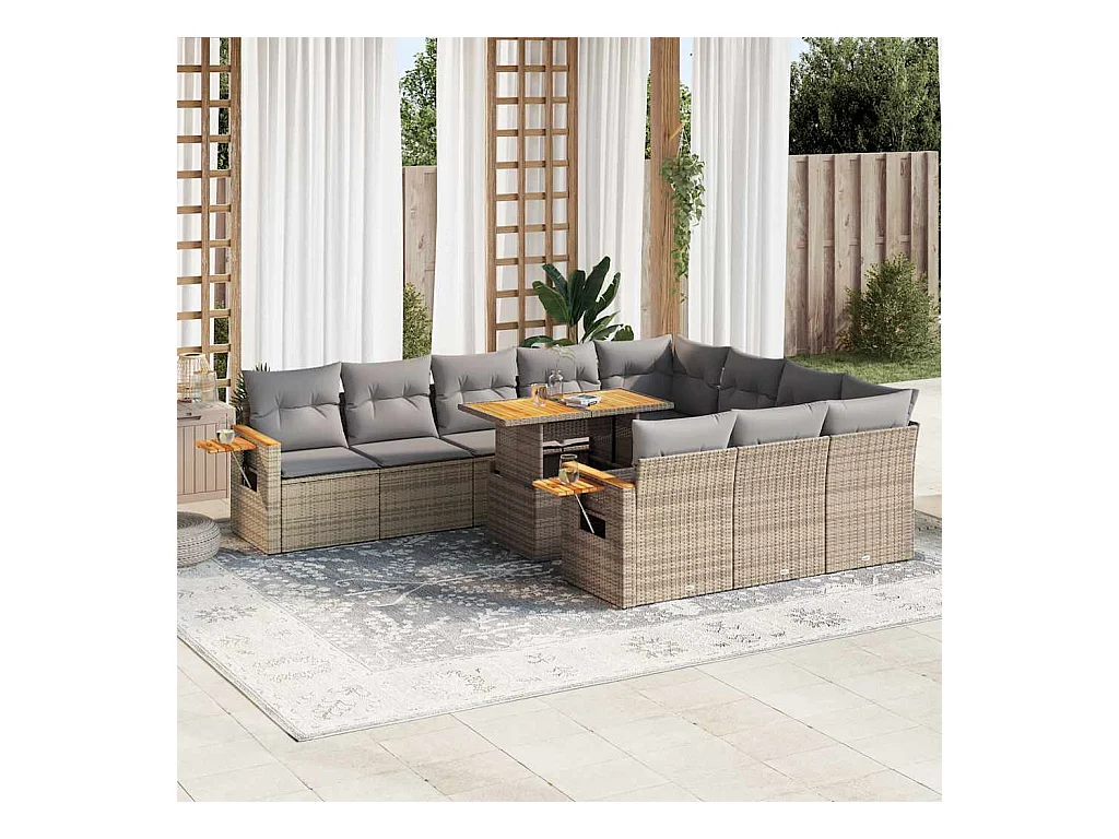Salon de jardin 11 pièces avec coussins beige résine tressée acacia