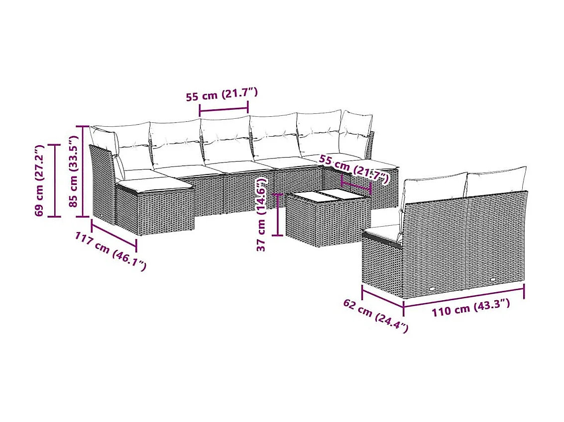 Salon de jardin 9 pièces avec coussins gris clair résine tressée