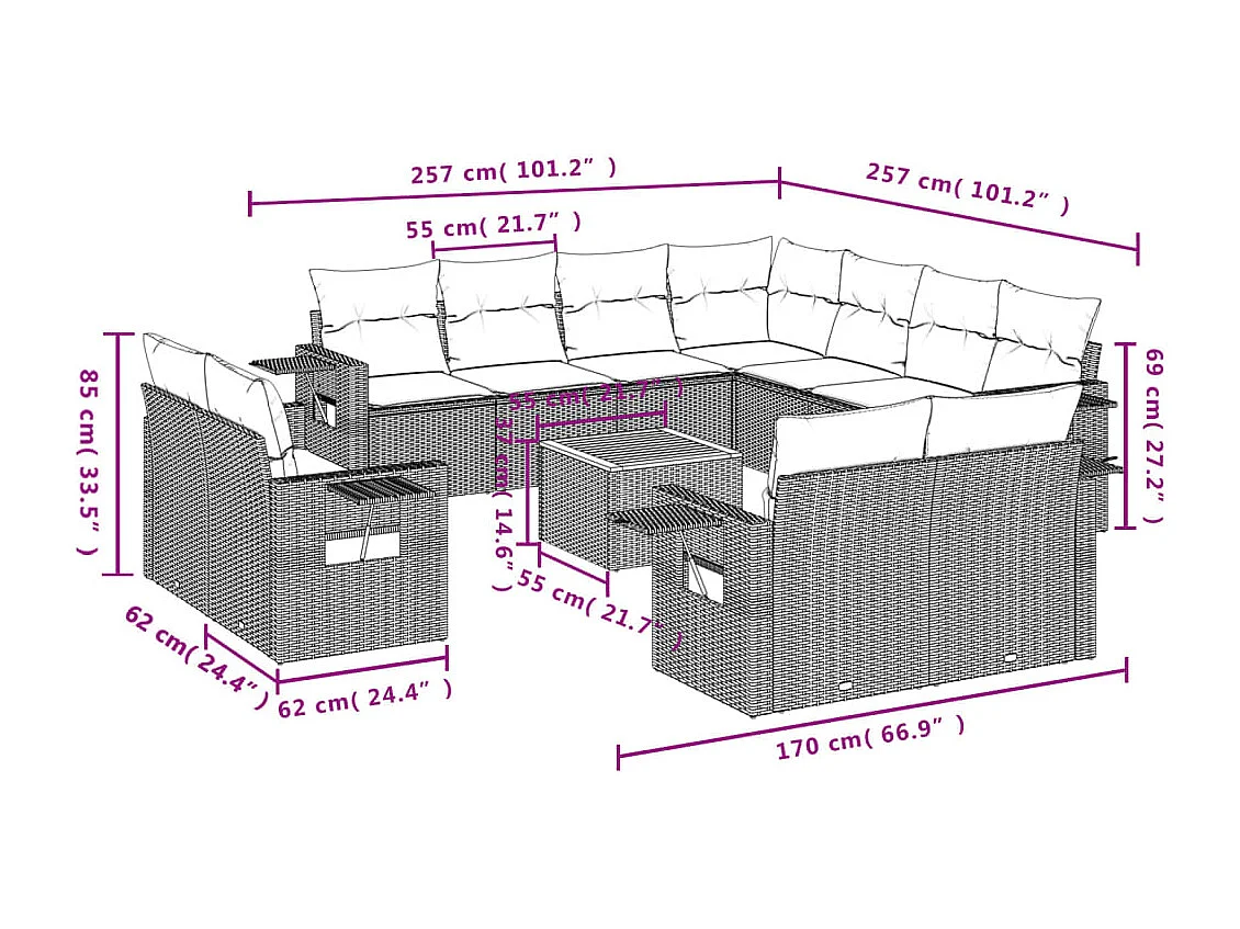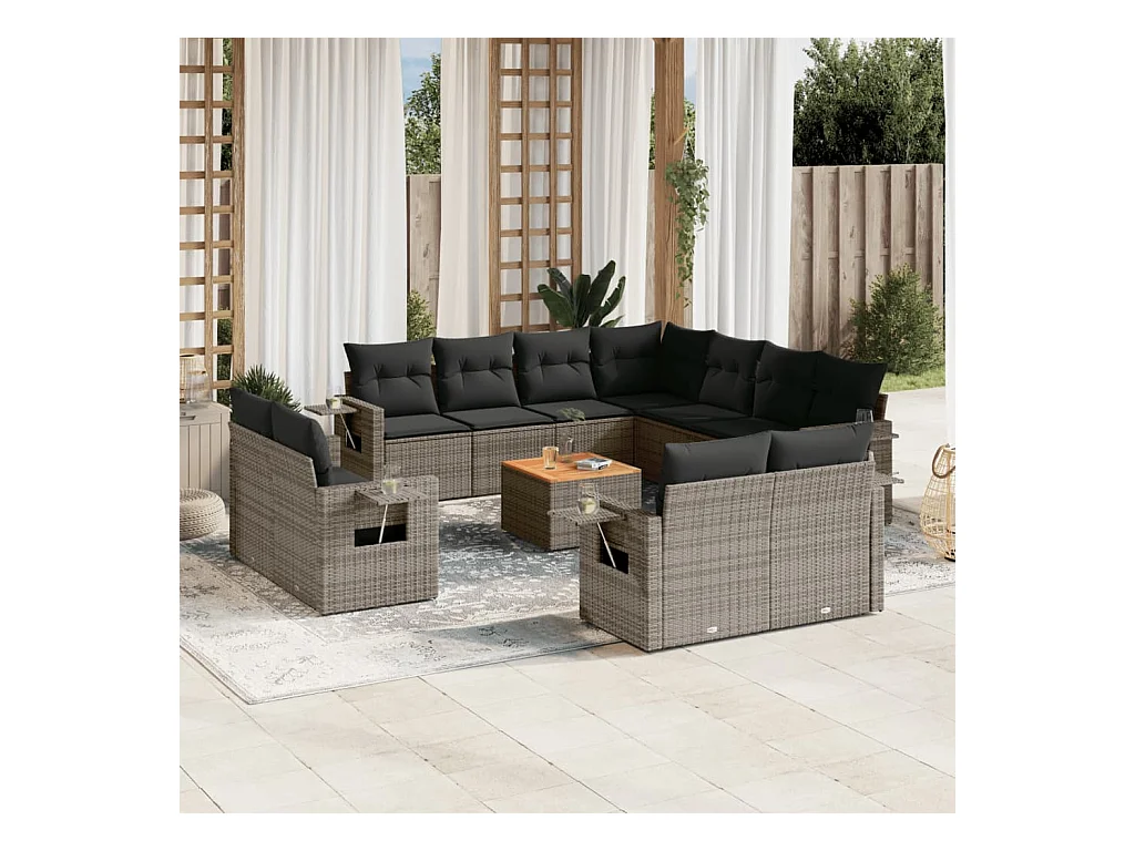 Salon de jardin avec coussins 12 pcs gris résine tressée