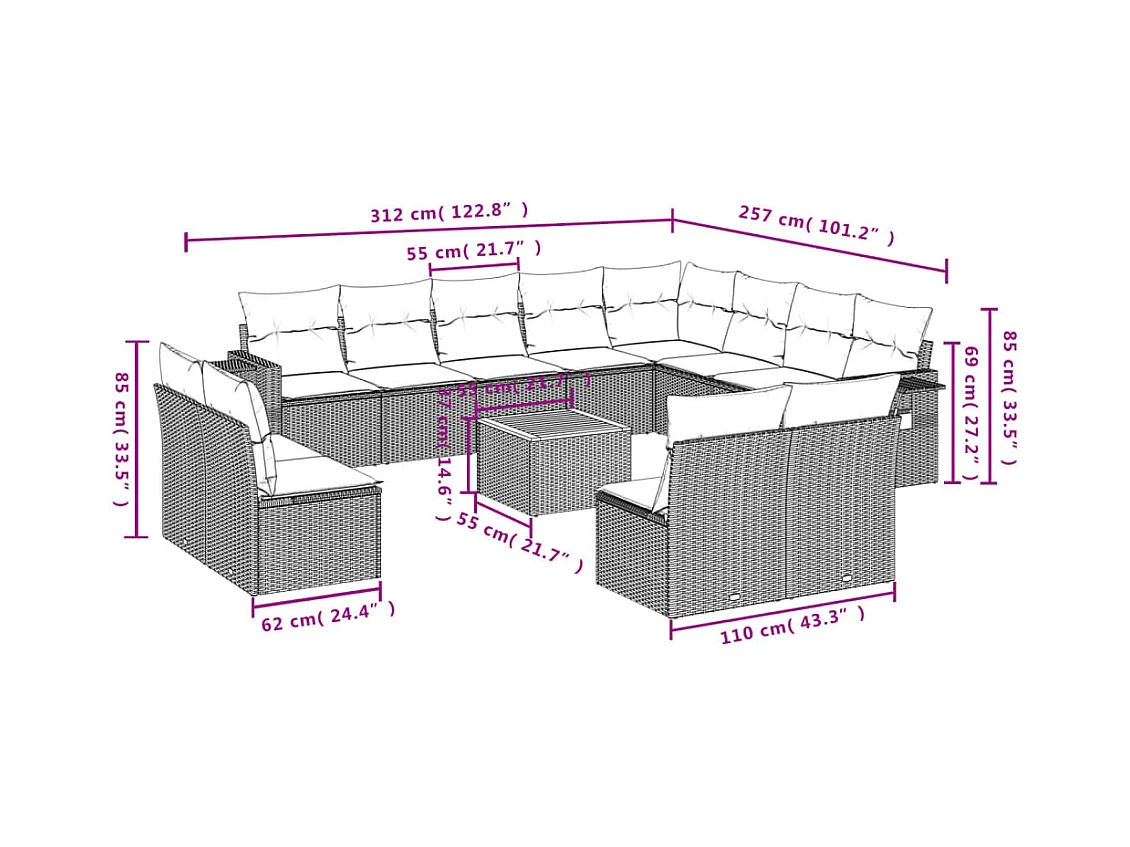 Salon de jardin avec coussins 12 pcs beige résine tressée