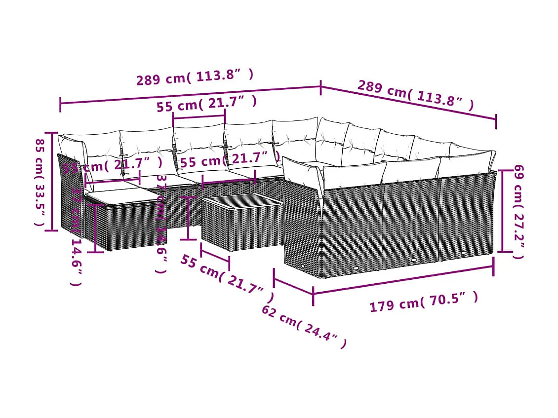 Salon de jardin avec coussins 13 pcs noir résine tressée