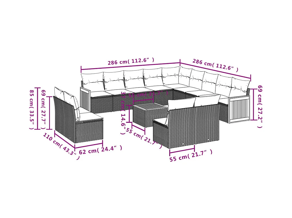 Salon de jardin avec coussins 14 pcs gris résine tressée