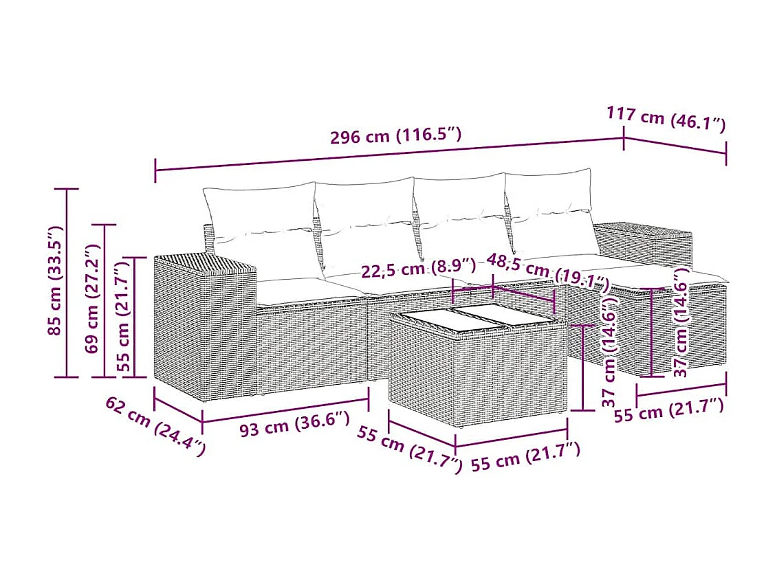 Salon de jardin avec coussins 6 pcs marron résine tressée