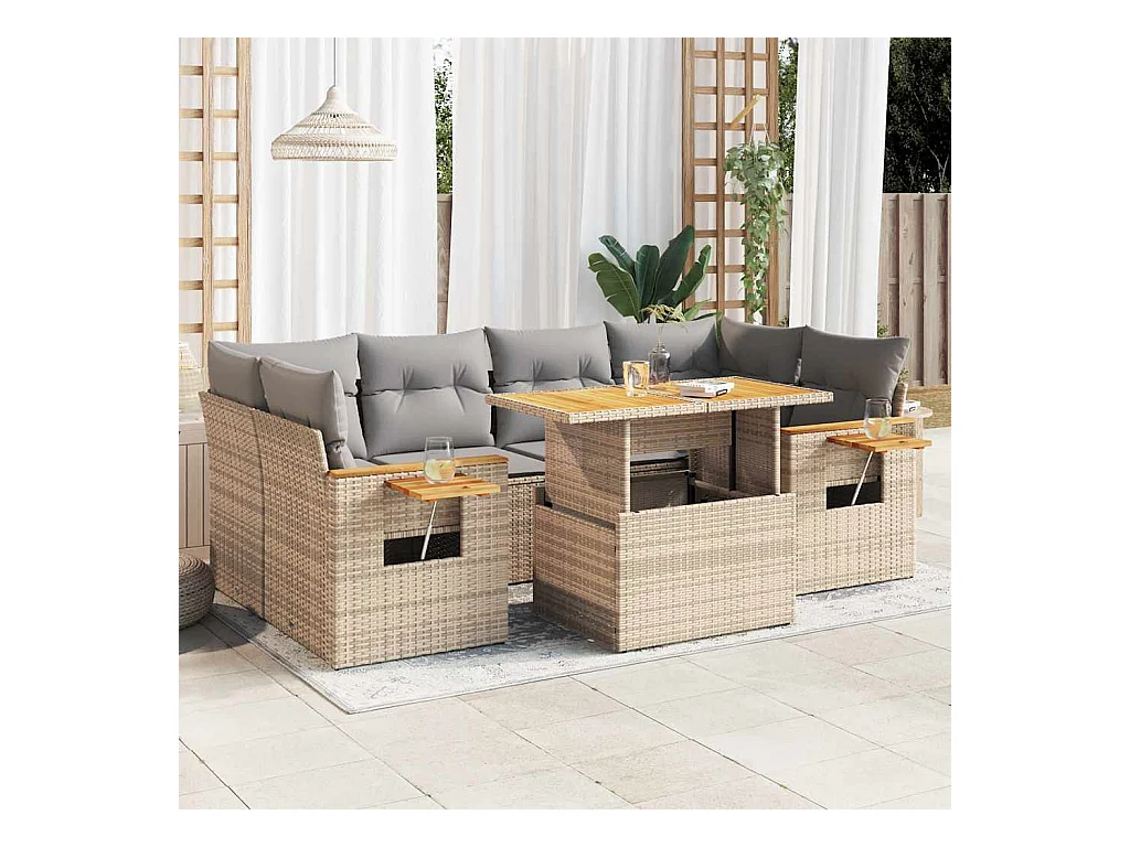 Ensemble à manger de jardin et coussins 7pcs beige rotin acacia