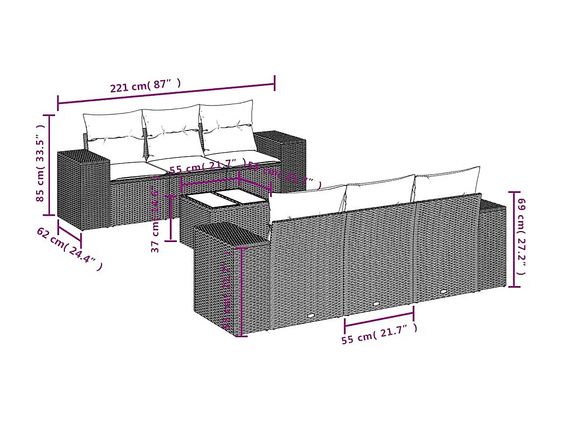 Salon de jardin avec coussins 7 pcs gris résine tressée