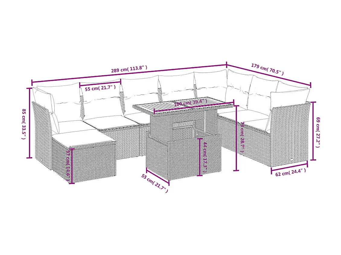 Salon de jardin avec coussins 9 pcs beige résine tressée