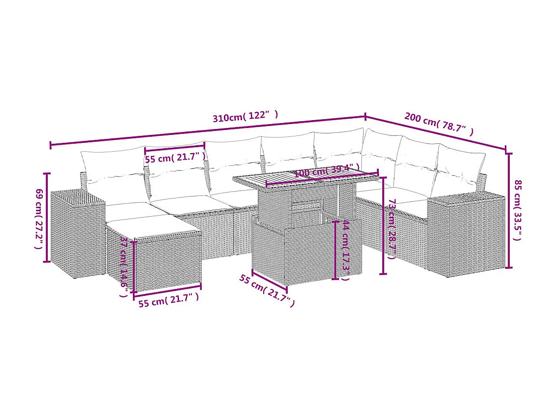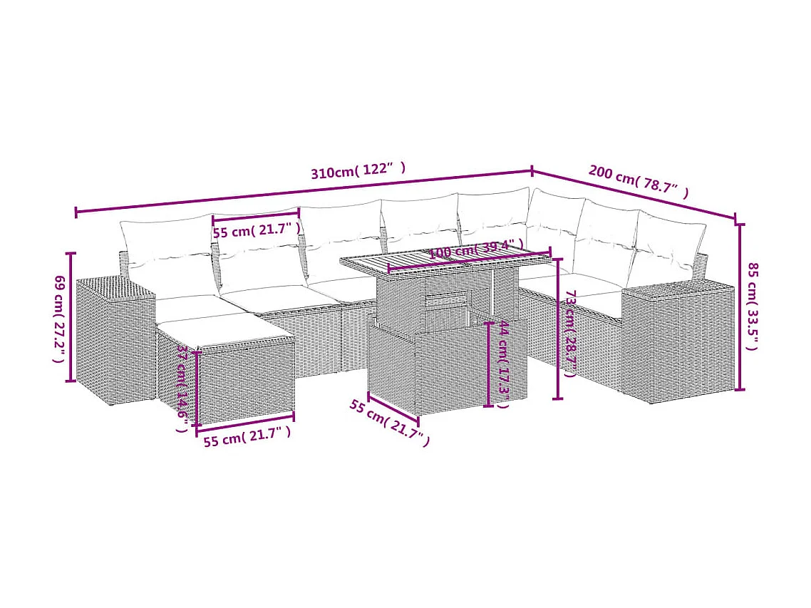 Salon de jardin avec coussins 9 pcs beige résine tressée