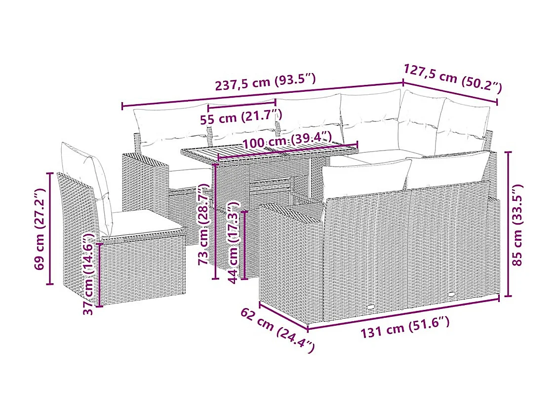 Salon de jardin avec coussins 9 pcs beige résine tressée