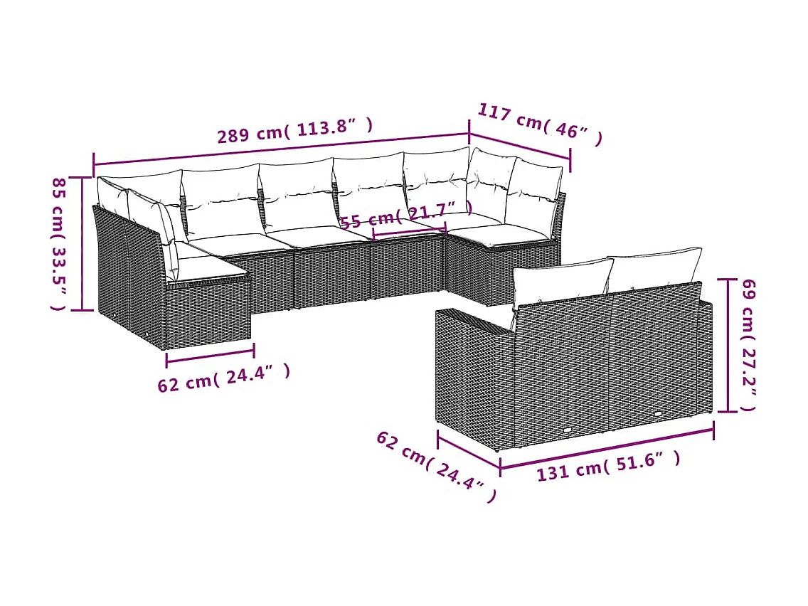 Salon de jardin avec coussins 9 pcs beige résine tressée