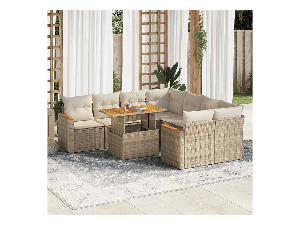 Ensemble à manger de jardin et coussins 9pcs beige rotin acacia