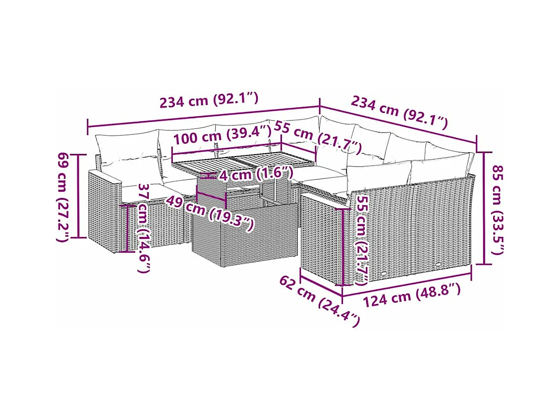 Ensemble à manger d'extérieur et coussins 9 pcs résine tressée