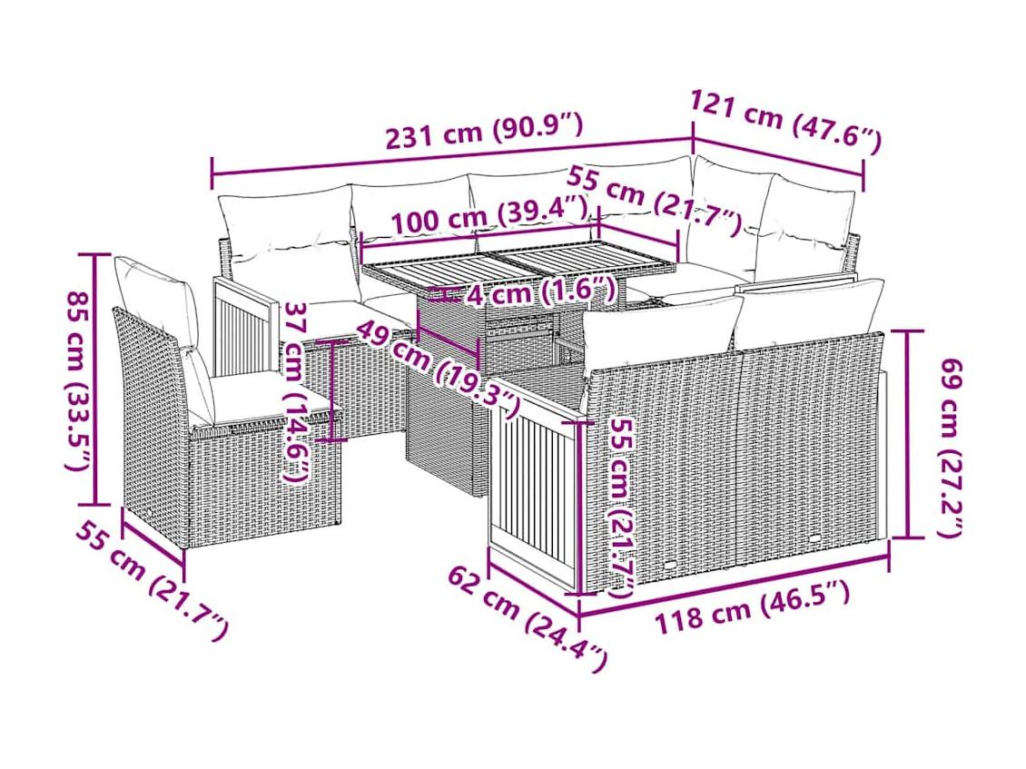 Salon de jardin 9 pcs avec coussins gris résine tressée
