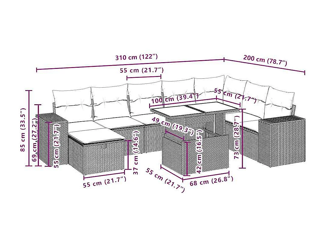 Salon de jardin avec coussins 9 pcs marron résine tressée
