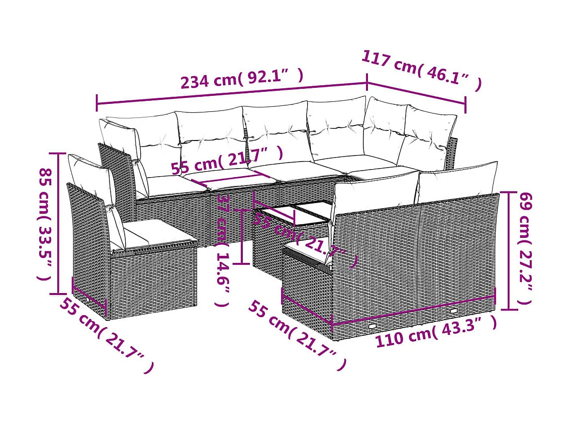 Salon de jardin 8 pcs avec coussins marron résine tressée