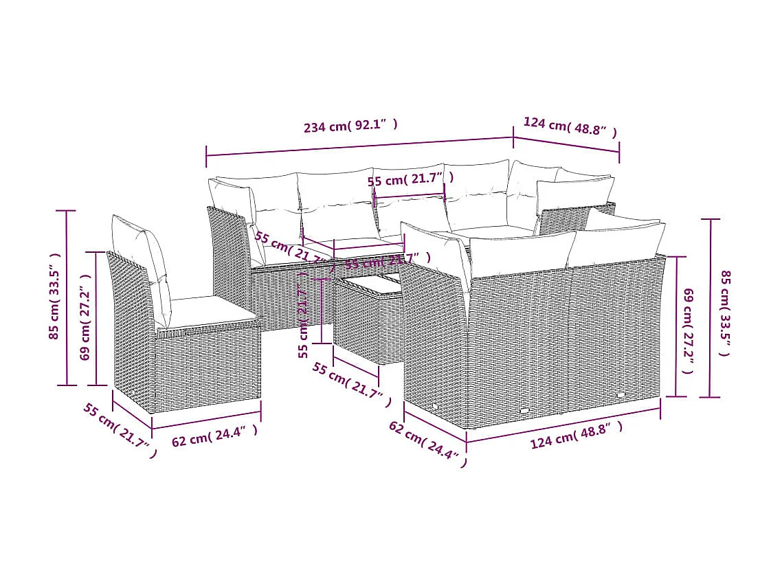 Salon de jardin avec coussins 9 pcs marron résine tressée